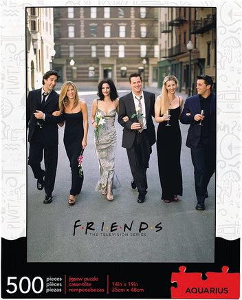 500 PIECE JIGSAW PUZZLE: Piece together this 500 piece Friends puzzle featuring the gang all dressed up, and reminisce your favorite moments from most iconic sitcoms of all time. Could you be having any more fun? Completed puzzle measures 14 x 19 in.