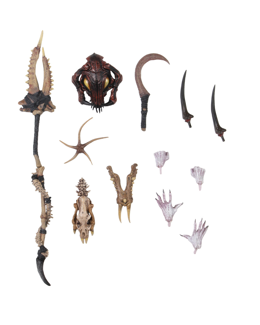 In place of the traditional tech, gadgets, and armor worn by other yautja, the Alpha's attire takes on a more insect-like appearance; a subtle homage to the original 1987 Predator design. Standing at 8" tall with over 30 points of articulation, the Ultimate Alpha Predator is an entirely new sculpt kitted out with an array of accessories including a removable mask, hook, gauntlets, and 3 pairs of interchangeable hands. Classic Predator weapons such as the wrist blades, staff, and shuriken, have been reimagined to fit his unique theme.