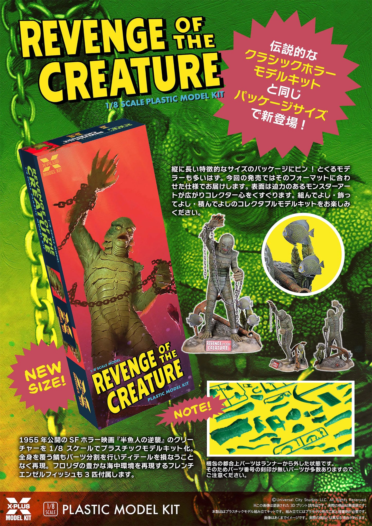 X Plus brings us an awesome 1/8-scale model kit inspired by the classic 1955 film "Revenge of the Creature"! It's packed into a box that's the same size as its classic release, with its distinctive tall, narrow vertical format. You'll love the impressive art on the box, and you'll enjoy assembling and painting this highly detailed kit, with every one of the Creature's scales painstakingly sculpted. Three French angelfish are included to represent the rich underwater environment of Florida, too. Order this amazing retro-style kit for your own collection today!