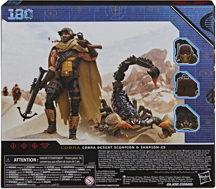 New to the G.I. Joe Classified Series line, Cobra Desert Scorpion & SKRP10N-25 pet come ready for adventure, with multiple points of articulation for high poseability. This Cobra Desert Scorpion figure contains 12 character-inspired accessory pieces including swapable faceplate for multiple looks, backpack with connecting cord, 2 knives, grapple launcher with removable hook and attached line, scorpion prod, 2 claws, and weapon accessories; plus softgoods cape and helmet skirt.