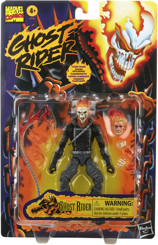 Wielding supernatural abilities and weapons from the back of his flaming motorcycle, Ghost Rider roams the mortal world as the Spirit of Vengeance. The vengeance-seeking Ghost Rider rides into Marvel Legends with this 6-inch comics figure, features classic deco from Johnny Blaze’s appearances throughout the comics, is highly posable for display and play and includes 6 character-inspired accessories -- including the flame chain! This Ghost Rider figure comes in retro-style packaging to recreate the classic Marvel Legends releases!